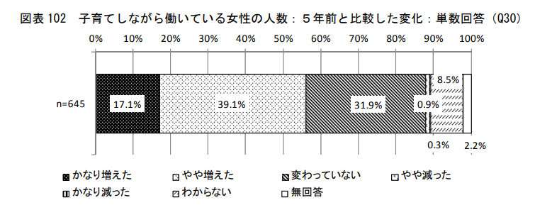 直近5年間で比較すると、「子育てしながら正社員として働いている女性が増えている」という回答は56.2%に達しています。
