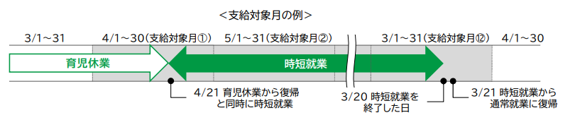 「育児時短就業給付金」の支給期間は、原則として「育児時短就業を開始した日の属する月から育児時短就業を終了した日の属する月までの各暦月」と定められています。