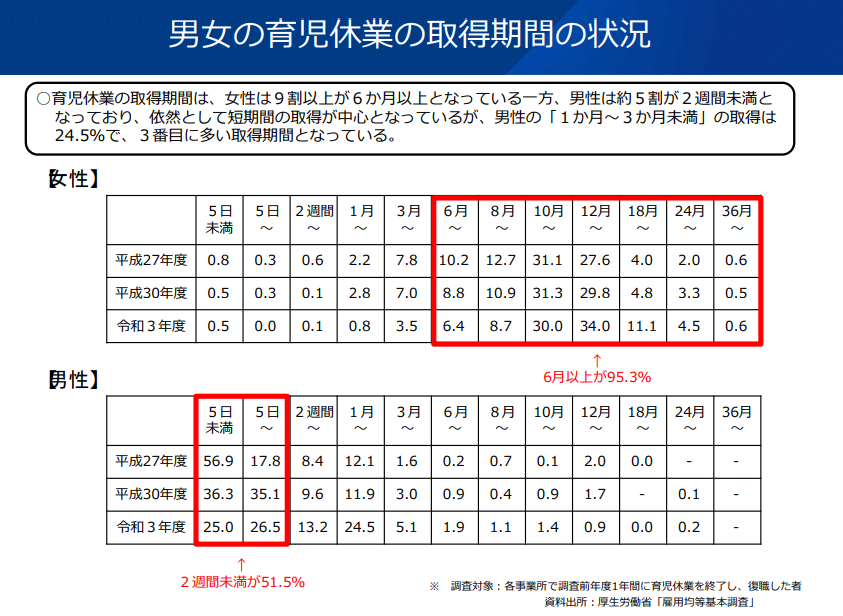今後、長期間育休を取得する男性が増えることも期待されますが、現状は男女差が大きいことがわかります。